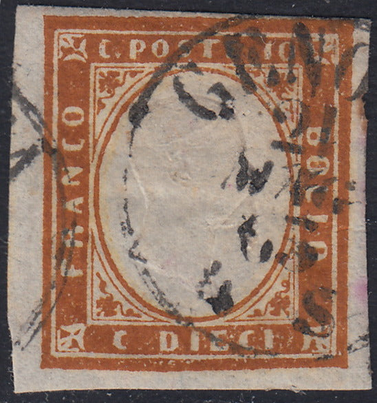 Sard600 - 1862 - IV emissione c. 10 arancio rossastro II tavola usato a Genova 21/5/63 (14Dh)
