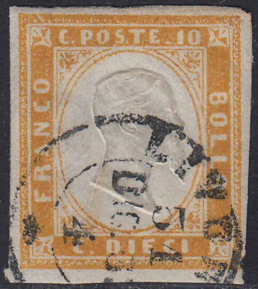 Sard828 - 1862 - IV emissione c. 10 giallo ocra II tavola usato Livorno (14Dd)