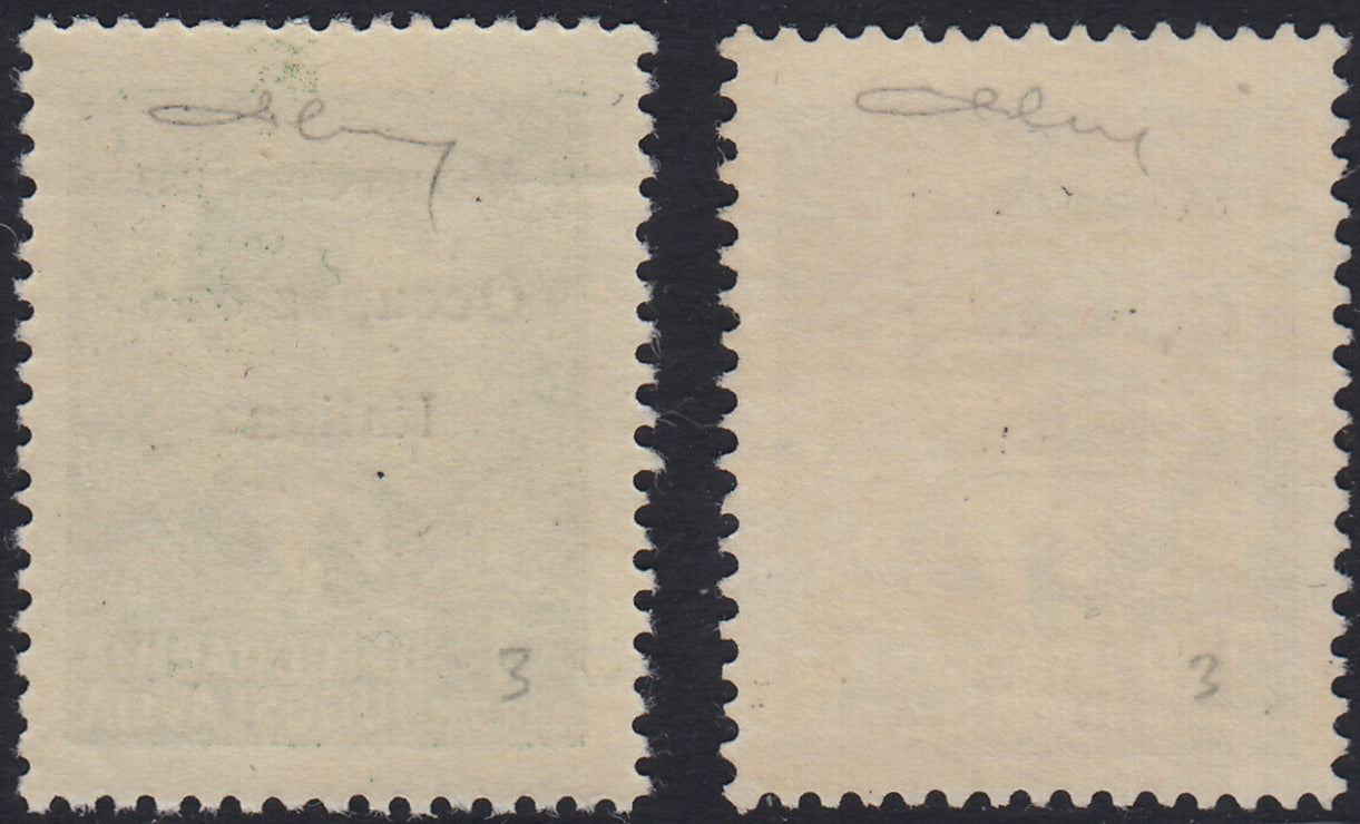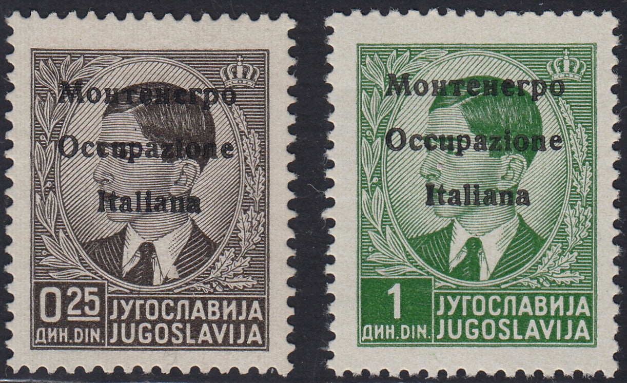 1941 - Occupazione Italiana del Montenegro, Saggio di soprastampa posizione n. 3 "Montenegro" + "Occupazione Italiana" nei valori da 0,25d. nero e 1d. verde