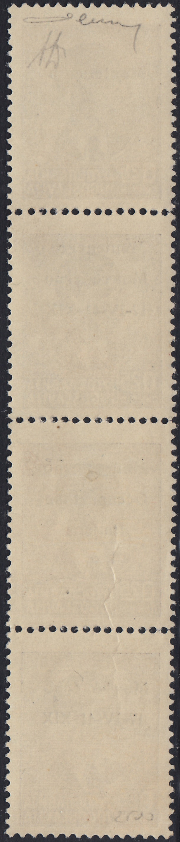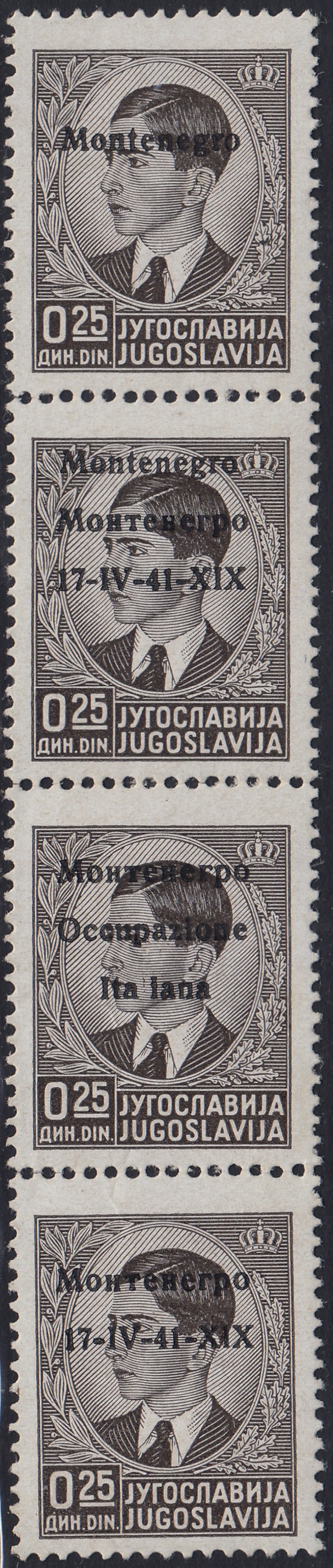 1941 - Occupazione Italiana del Montenegro, Saggio di soprastampa striscia verticale di 4 esemplari del valore da 0,25d. nero nuova gomma integra