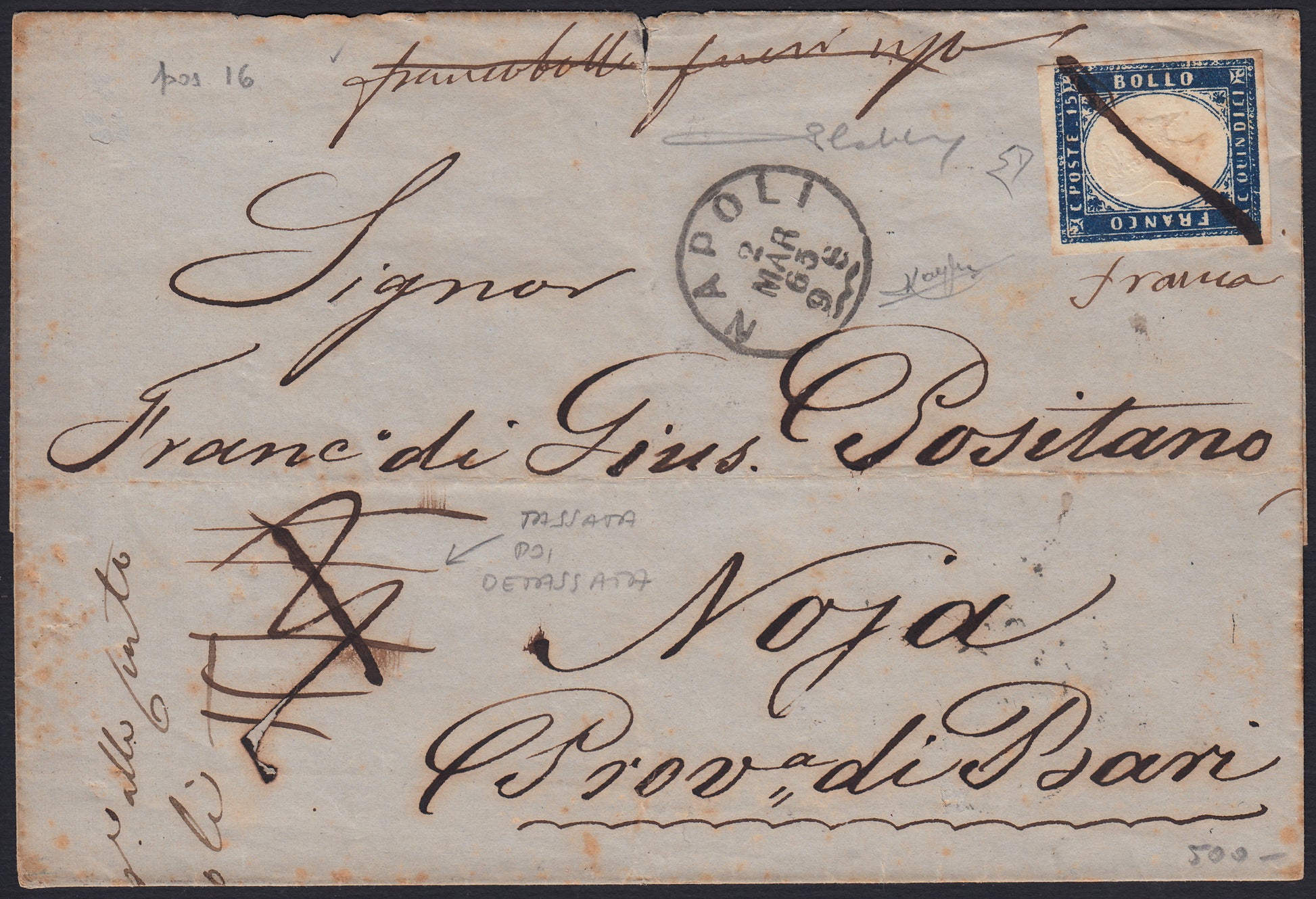 1863 - Lettera spedita da Napoli per Mola di Bari 2/3/63 con c. 15 azzurro scuro tassato e detassato, lil francobollo è annullato a penna con dicitura Francobollo fuori uso anch'essa depennata
