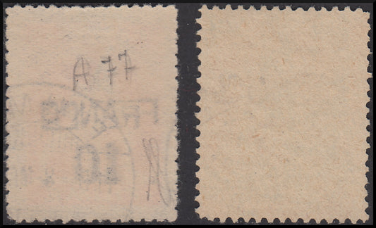 Fiume141 - 1919 - Allegories and Views, type "A" paper, hand overprinted Franco and cipher, paper A c. 5 on c. 20 emerald green + c. 10 on c. 45 used orange (A75, A77)