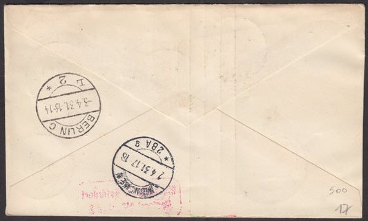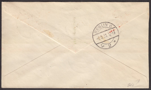 1931 - First flight Milan - Berlin 1/5/31 stamped with S. Antonio c. 25 green + Virgil c.20 orange + PA c. 80 orange (293 + 283 + A13)
