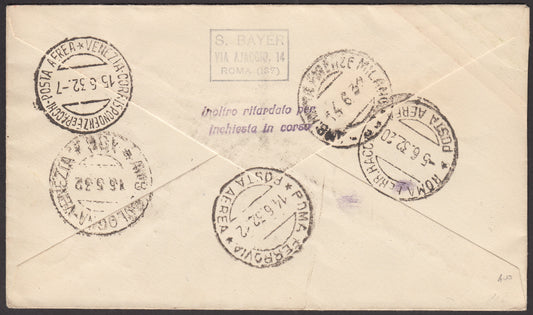 1932 - First Flight Caprera - Venice 5/6/32 stamped with Garibaldi c. 10 slate gray + P.Aerea c. 50 red (315 + A32)
