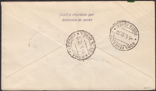 1932 - Airmail, Rome-Genoa 5/6/32 with Imperiale c. 20 carmine two copies + Dante c. 20 carmine, twin values (247+ 305)