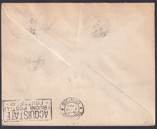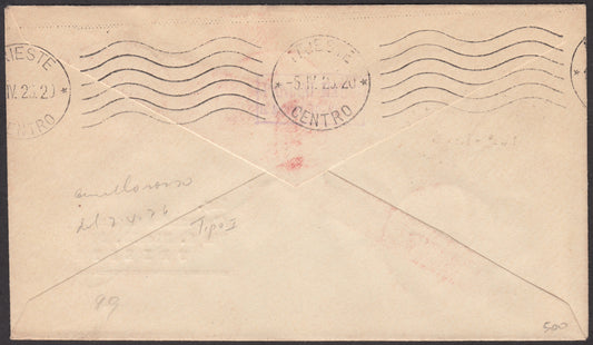 1926 - First inaugural airmail flight Genoa-Rome-Naples-Palermo 22/5/26 stamped with Francescano c. 60 carmine two copies + postage due c. 30 ocher and carmine (195 + Tax23)