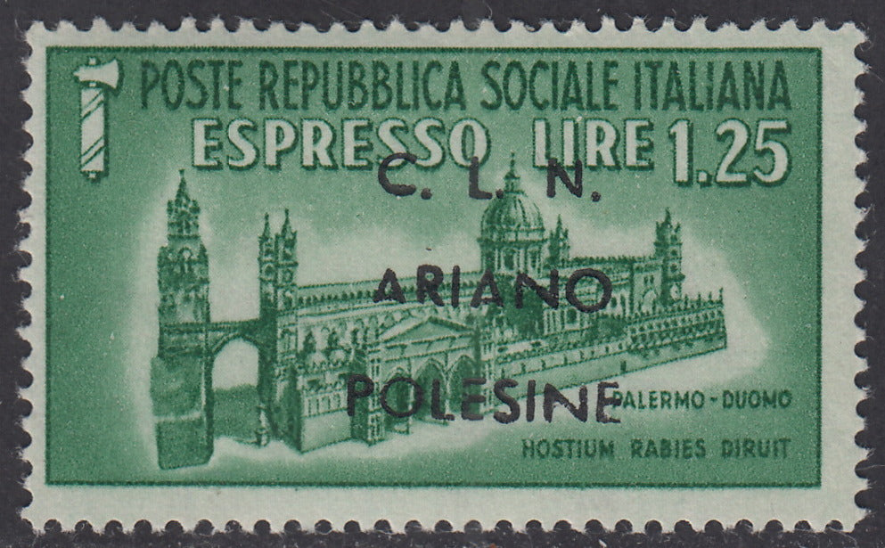 CLN28 - 1944 - RSI stamps overprinted "CLN ARIANO POLESINE" series of three stamps with overprints of different colors, new with intact gum (Unif. 38/40).