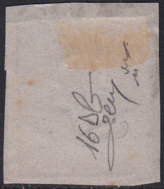 1860 - 1/2 dark blue tornese called "Croce di Savoia" used in the IL PAESE newspaper of 1/1/1861 containing news of the siege of Gaeta. Abrasions and slight retouching on the left side of the stamp, but rare together, position no. 54 of the table of 100