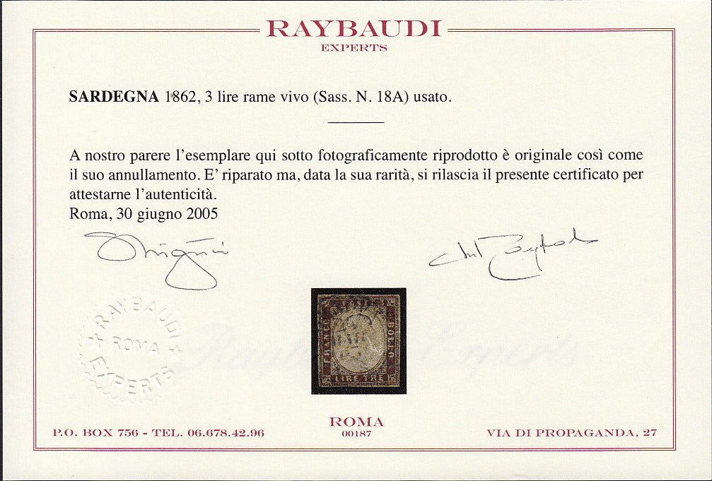 SPC s.a.s. issues, signed by owner Paolo Cardillo, official certificates of authenticity, guarantee, and appraisal for stamps from the Italian area.