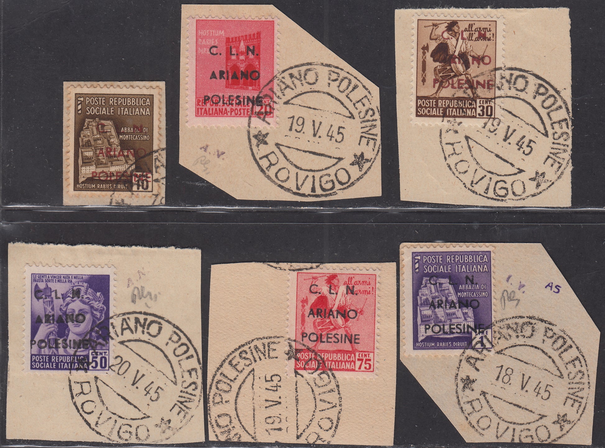 CLN28 - 1944 - Sellos RSI sobreimpresos "CLN ARIANO POLESINE" serie de tres sellos con sobreimpresiones de distintos colores, nuevos con goma intacta (Unif. 38/40).