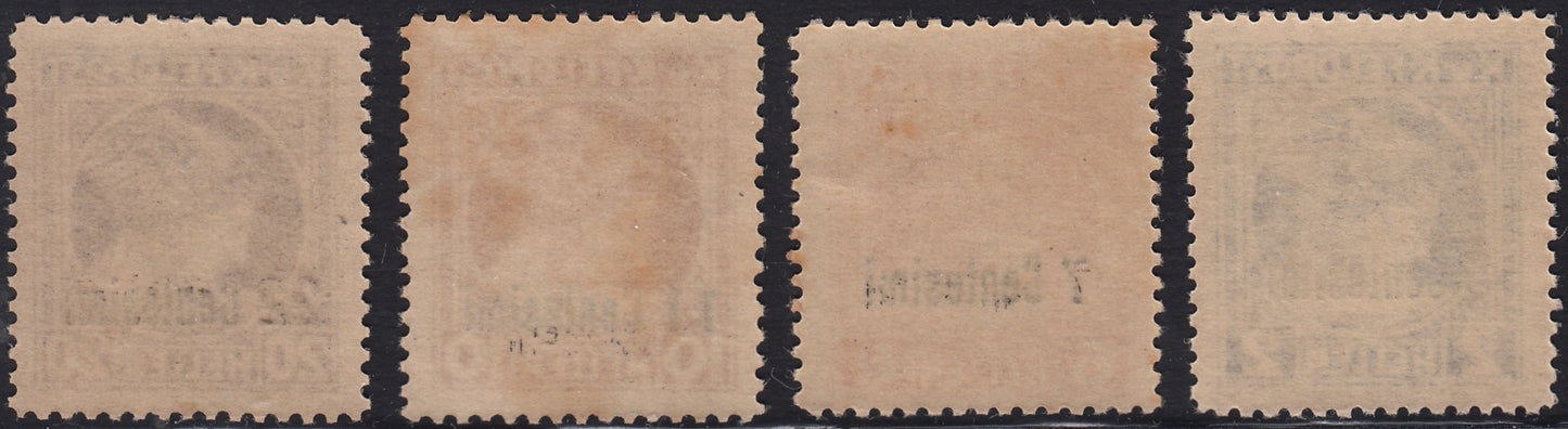 1918 - Francobolli per Giornali, rappresentanti la testa di Mercurio (messaggero degli Dei), serie di quattro valori con soprastampe in centesimi di lira nuova gomma integra.