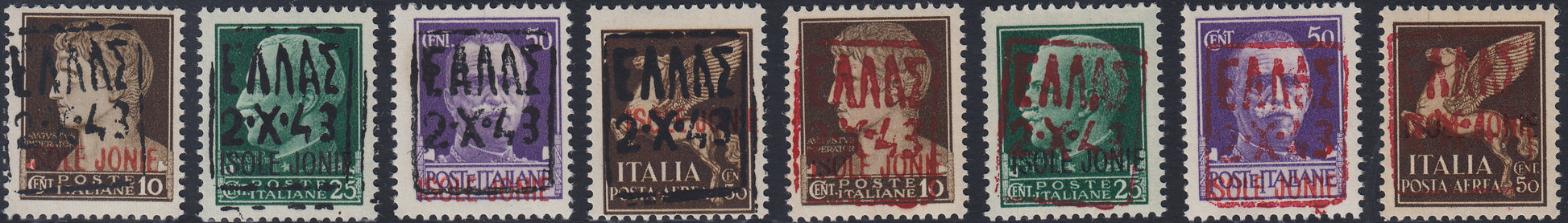 1943 - Francobolli d'Ialia soprastampati Isole Jonie con ulteriore soprastampa ZANTE in caratteri greci, giro completo degli otto valori con gomma integra