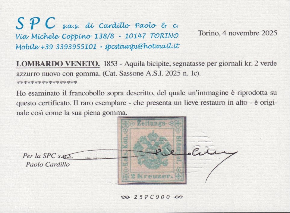 1853 - Aquila Bicipite, 2 kreuzer verde azzurro II tipo nuovo con piena gomma originale, lieve restauro lungo il margine superiore solo al fronte
