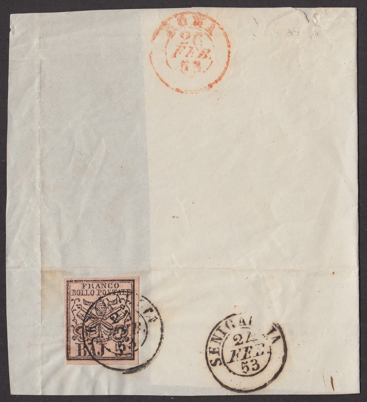 1852 - Stato Pontificio I emissione 5 baj rosa chiaro su grande frammento con anullo di Senigallia