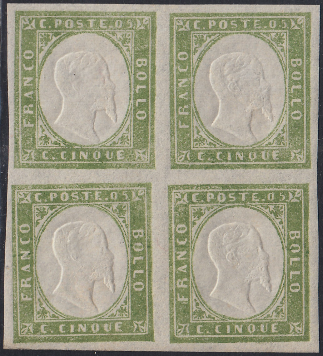 1863 - IV emissione c. 5 verde IV composizione blocco di 4 nuovo con gomma integra