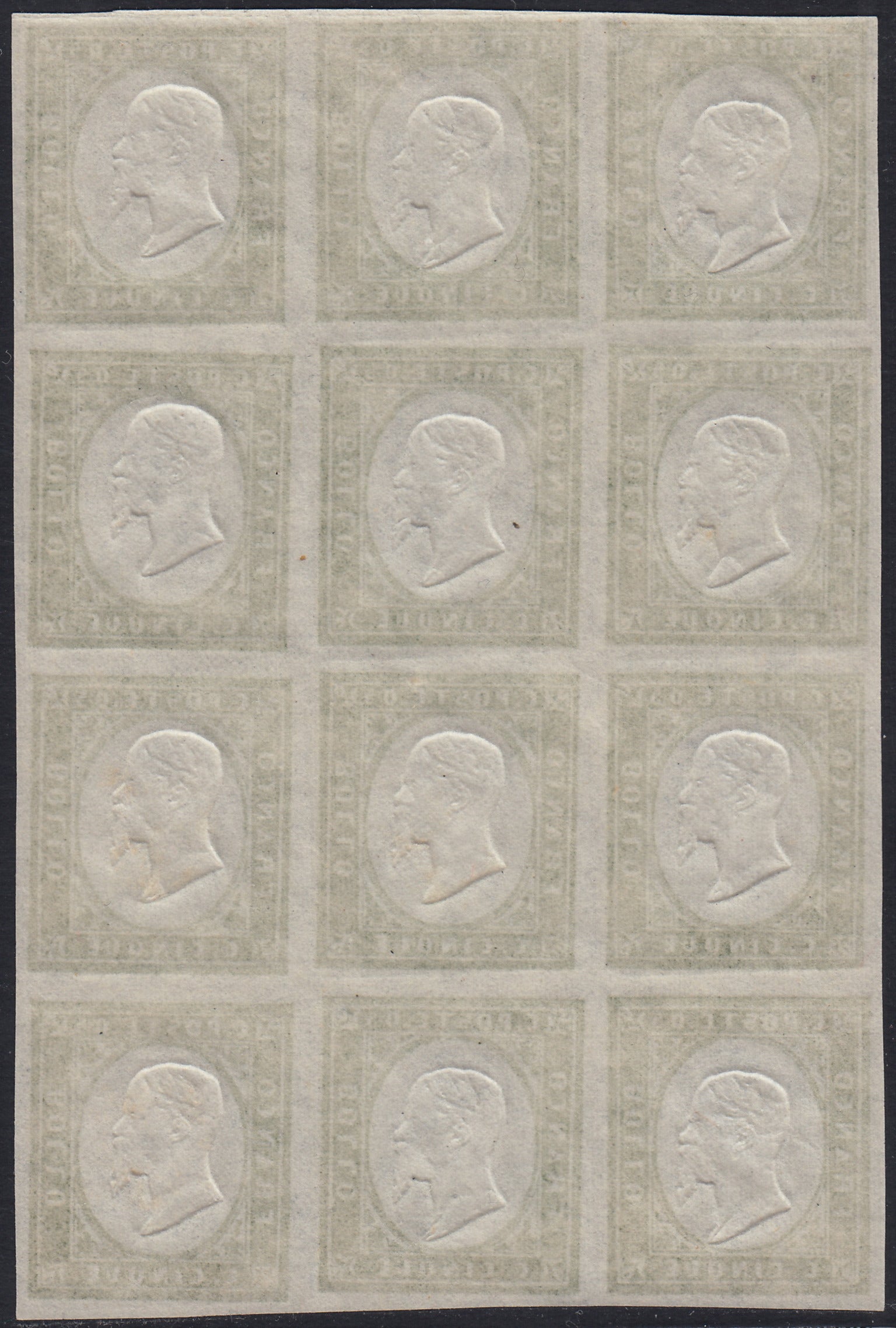BA25_525 - 1863 - IV emissione c. 5 verde chiaro smorto IV composizione blocco di 12 nuovo con gomma integra (13Eb)