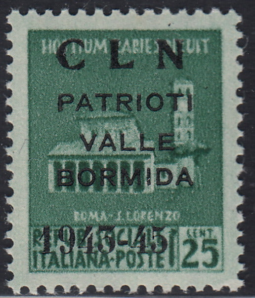 1945 - Monumenti distrutti, c.25 verde smeraldo con soprastampa "CLN / PATRIOTI / VALLE / BORMIDA / 1943-45"