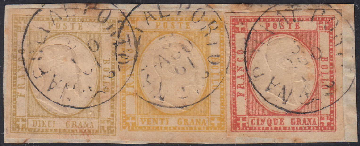 BO2511_59 - 1861 - Frammento Napoli al Porto 31/8/61 affrancato con gr. 5 rosso carminio + gr. 10 bistro oliva + gr. 20 giallo (21 + 22b + 23)