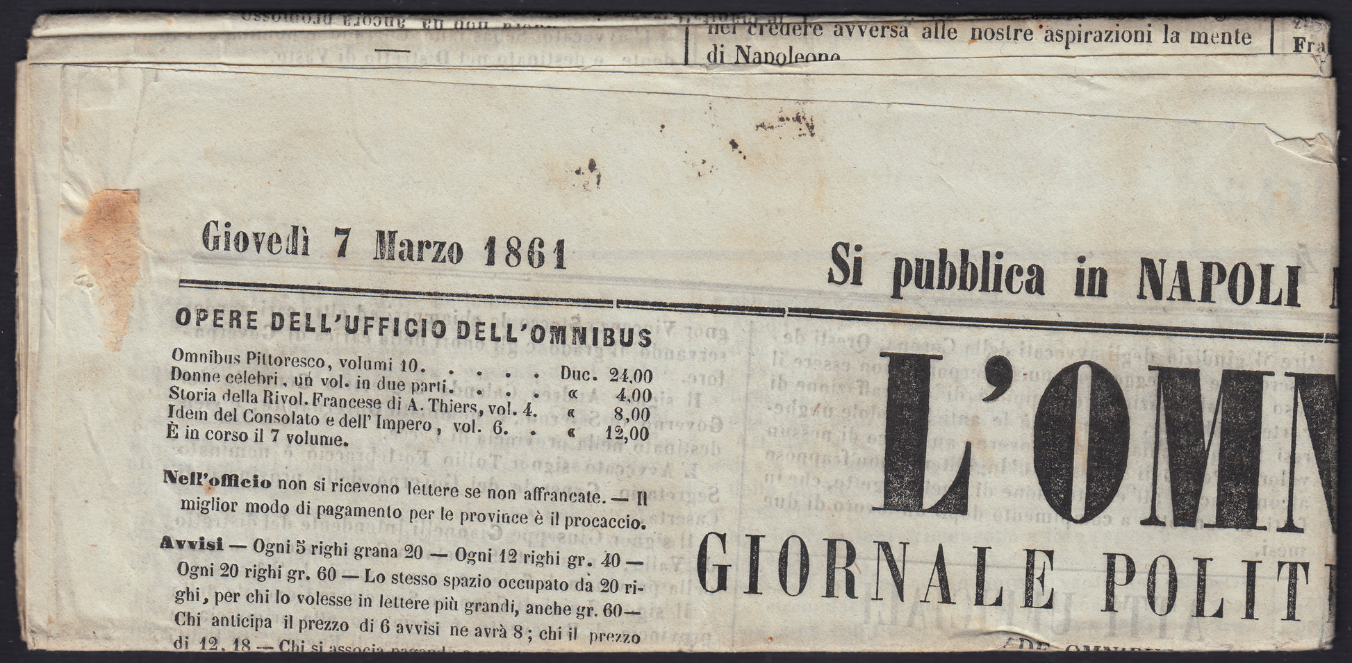1861 - Giornale "l'Omnibus" del 7/3/61 affrancato con 1/2 tornese verde giallo chiaro, obliterato con la cartella "ANNULLATO" tipica del primo periodo di questa emissione.