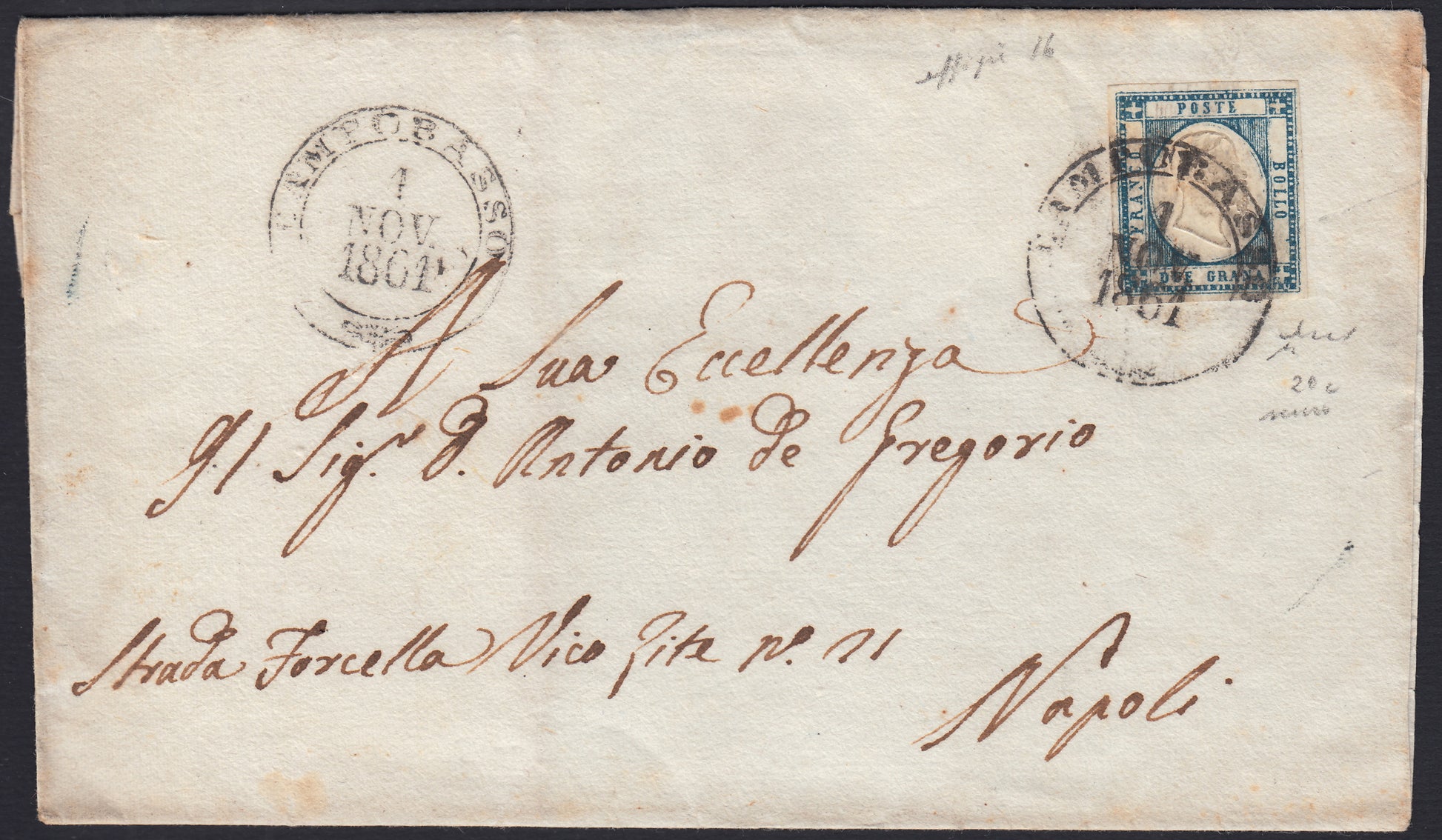 BO2512_47 - 1861 - Lettera spedita da Campobasso per Napoli 1/11/61 affrancata con gr. 2 azzurro ardesia scuro (20c)