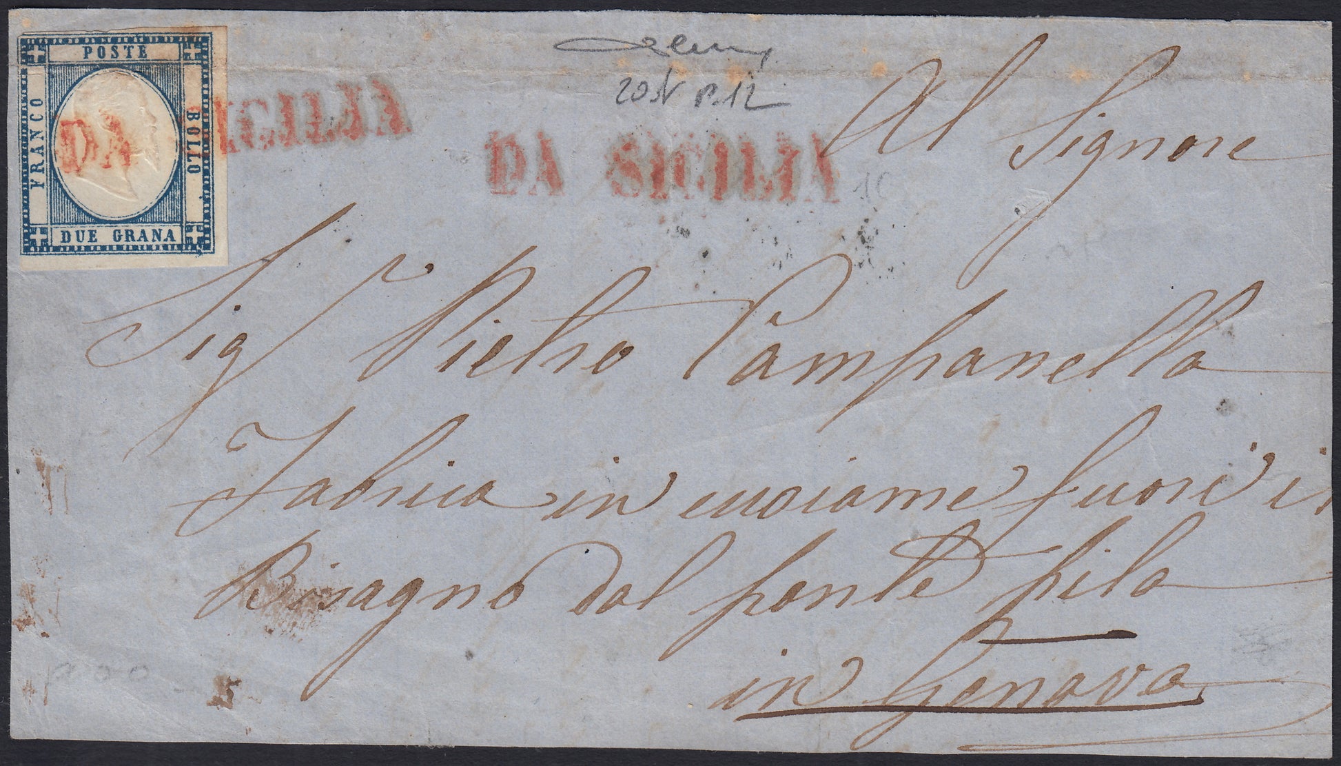 1861 - Effigie di Vittorio Emanuele II volta a destra, Province Napoletane, 2 grana azzurro scuro su frontespizio di lettera da Napoli per Genova , non annullato all'imbarco e obliteratioin transito a Genova con il lineare rosso DA SICILIA