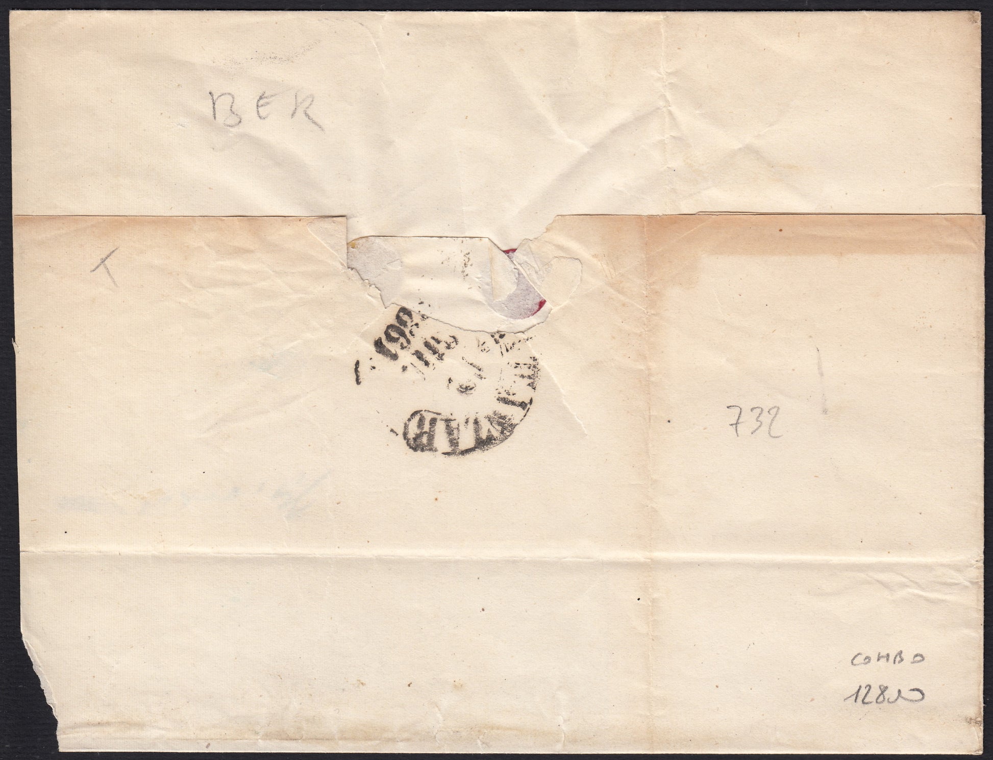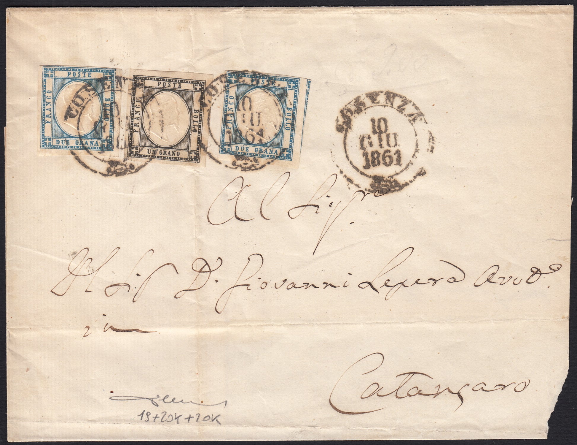 BO255_24 - 1861 - Lettera spedita da Cosenza per Catanzaro 10/6/61 affrancata con 1 grano nero + 2 grana azzurro chiaro x 2 (19 + 20k).