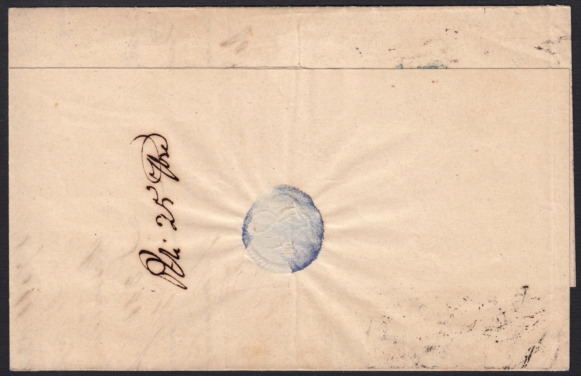 1857 - Lettera spedita da Firenze per Modena 23/9/57 affrancata con 4 crazie verde giallastro su carta bianca e filigrana linee ondulate