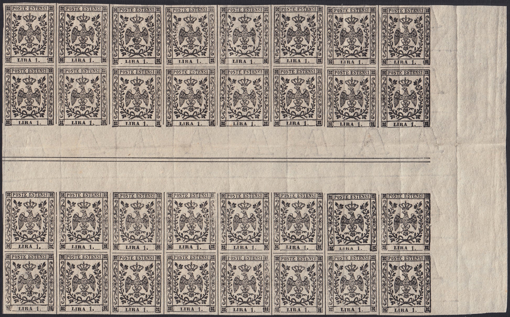 BO25_141 - 1852 - Aquila estense, L. 1 bianco, filigrana "A" normale, blocco di 32 esemplari con 8 intespazi orizzontali di gruppo nuovo gomma integra (11)