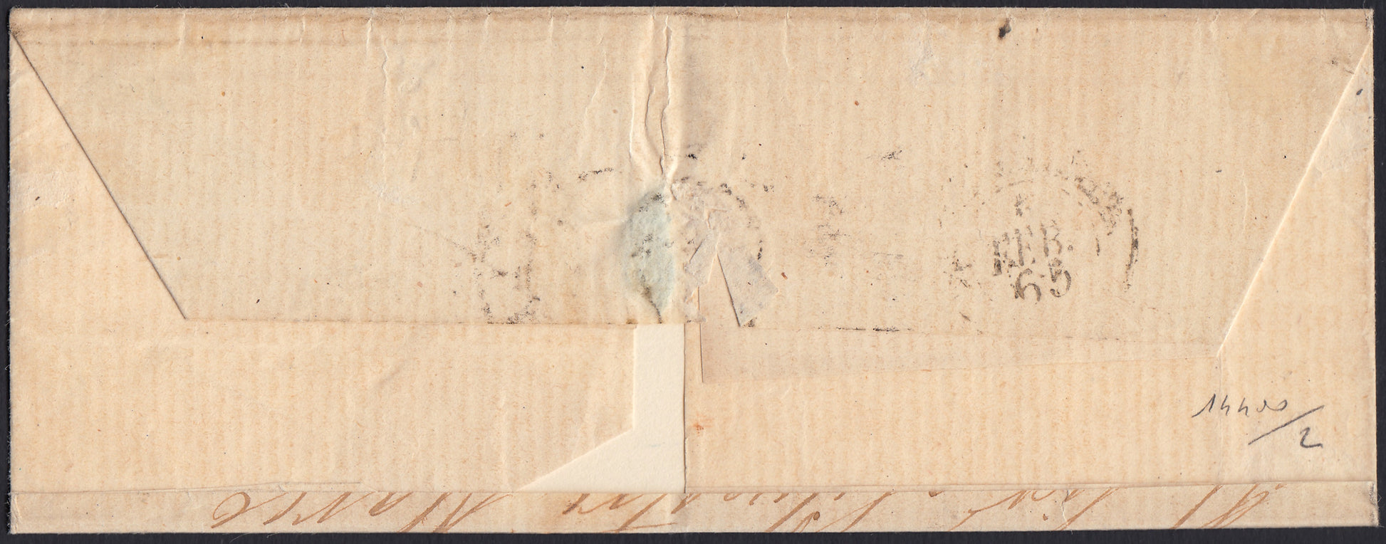 1865 - Testata di lettera spedita da Toscanella e affrancata con 1/2 baj violetto cupo striscia verticale di quattro esemplari