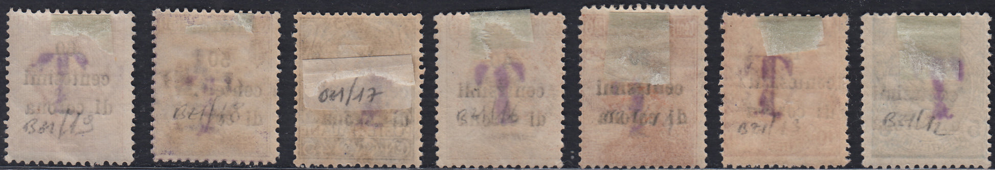 BZ29 - 1918/19 - Trentino Alto Adige, ufficio di Bolzano 1, francobolli di Regno in centesimi di corona e soprastampati grande lettera "T" a mano, nuovi (BZ1-12/14 + 16/19)