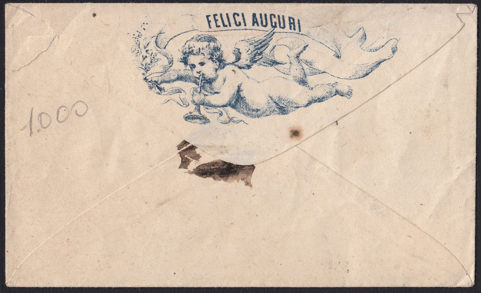 1881 - Busta relativa ad un biglietto d'Auguri (non compreso) da Savigliano per Città affrancato con c. 2 su L. 2 lacca scuro, oggetto molto particolare