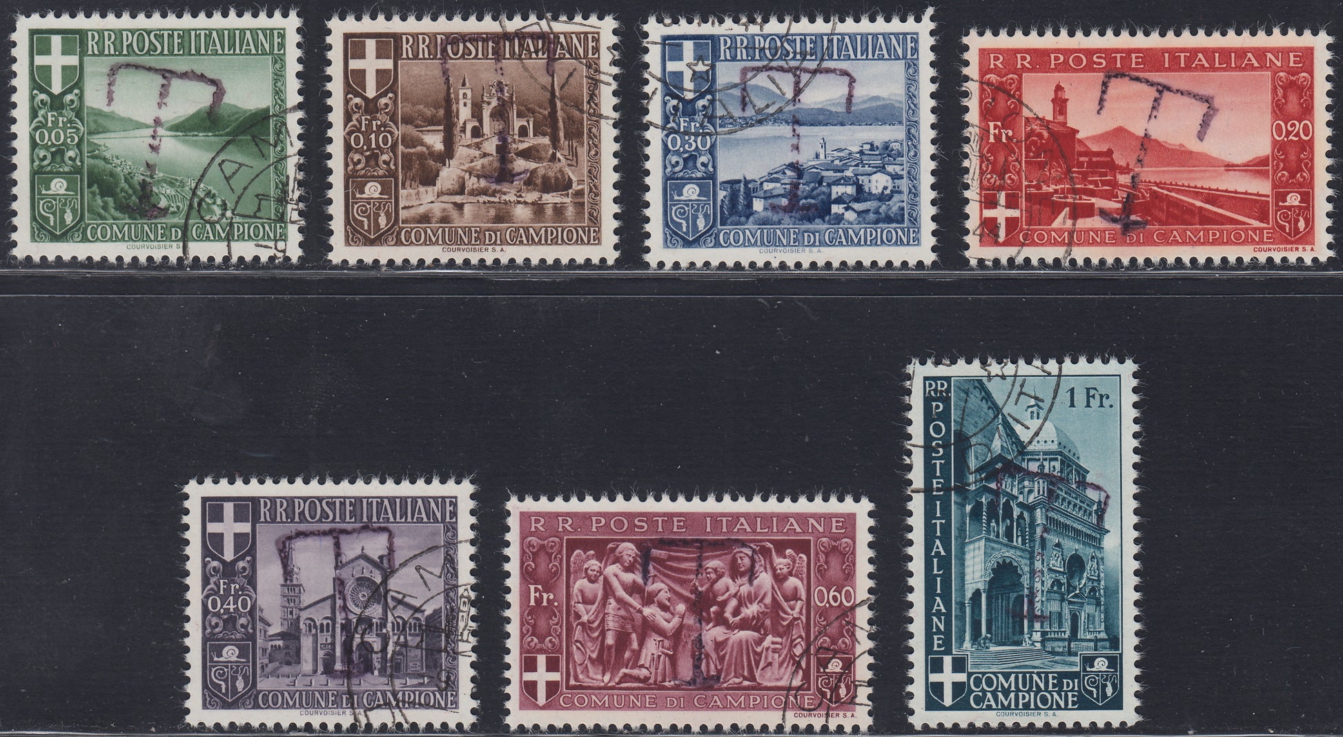 1944 - Campione d'Italia, Paesaggi e vedute, serie di sette valori usati, recanti a verso la "T" violetta.