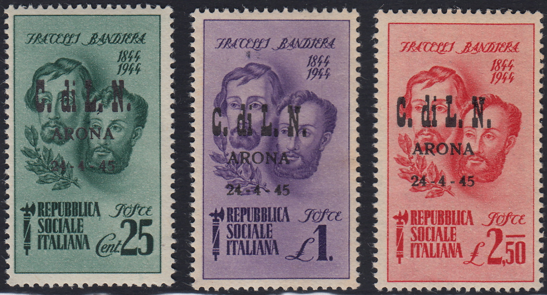 1945 - Fratelli Bandiera serie completa di tre valori soprastampati C. di L. N. Arona 24 - 4 - 45