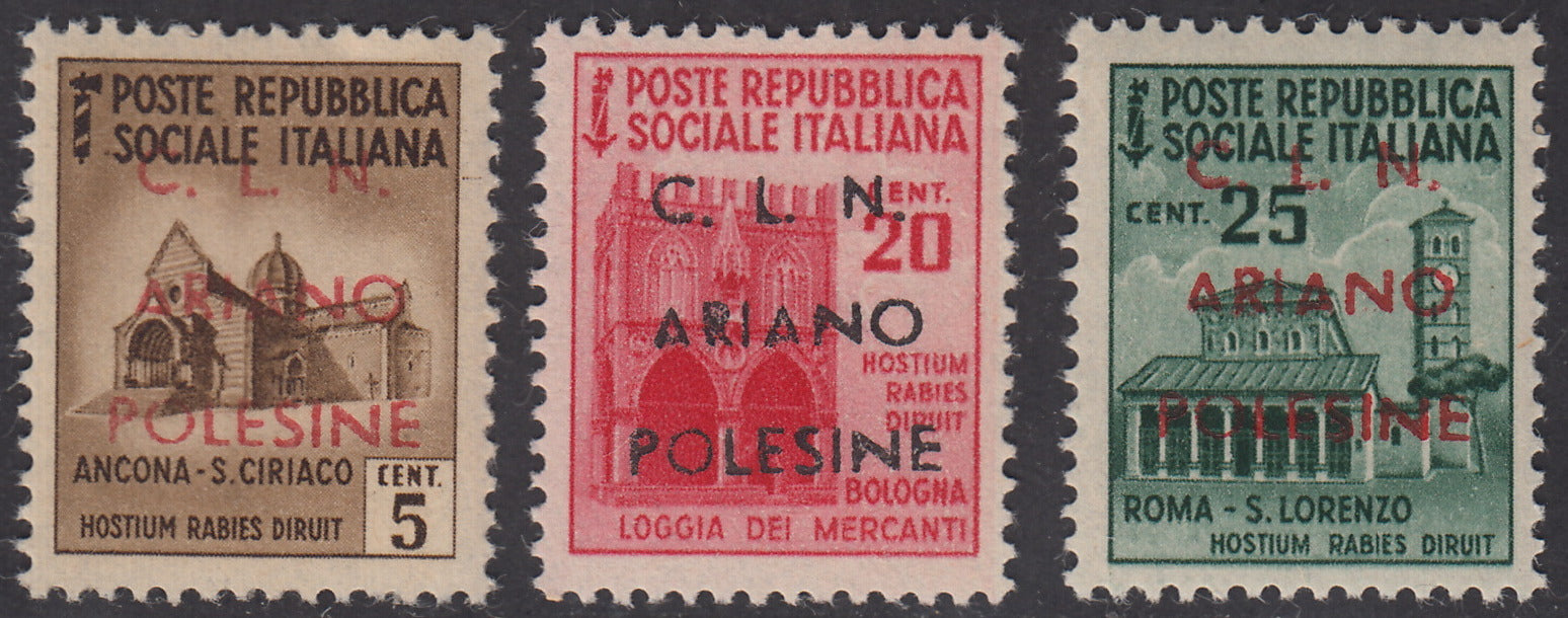1944 - Monumenti distrutti, serie di tre valori nuovi con gomma integra con soprastampa "C.L.N. ARIANO POLESINE"