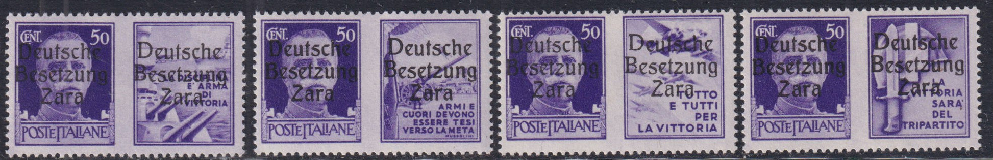 1943 - Occupazione tedesca di Zara, Propaganda di guerra, serie di 4 valori con gotico a sinistra e elzeviro a destra nuovi integri