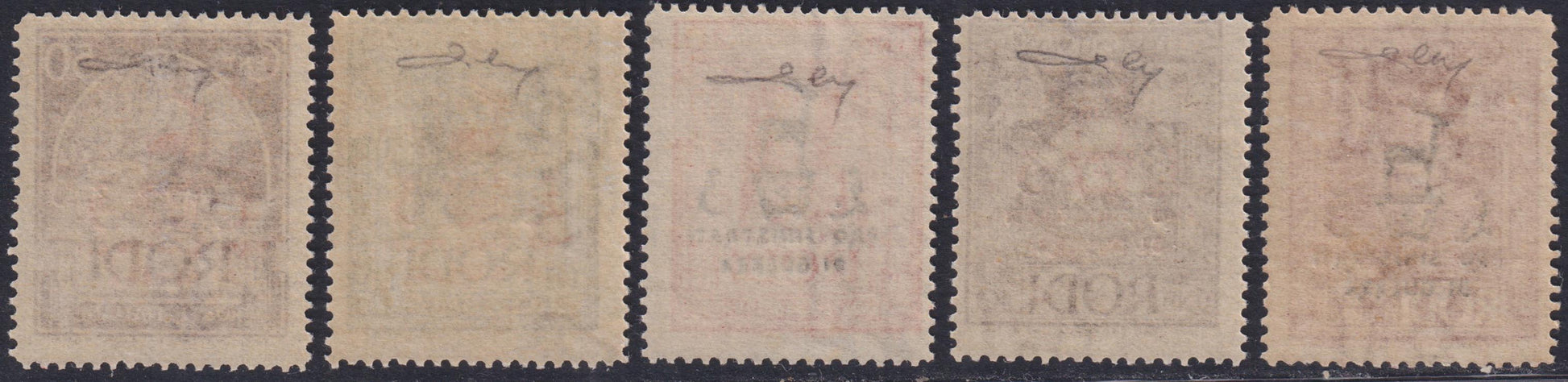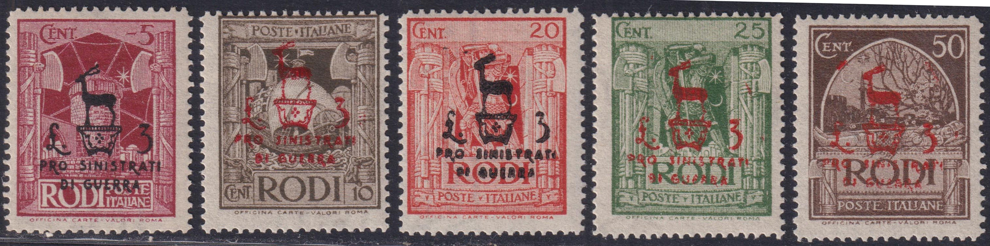 1944 - Occupazione tedesca dell'Egeo, francobolli della serie pittorica del 1938/39 soprastampati "PRO SINISTRATI DI GUERRA", serietta di cinque valori nuova con gomma integra