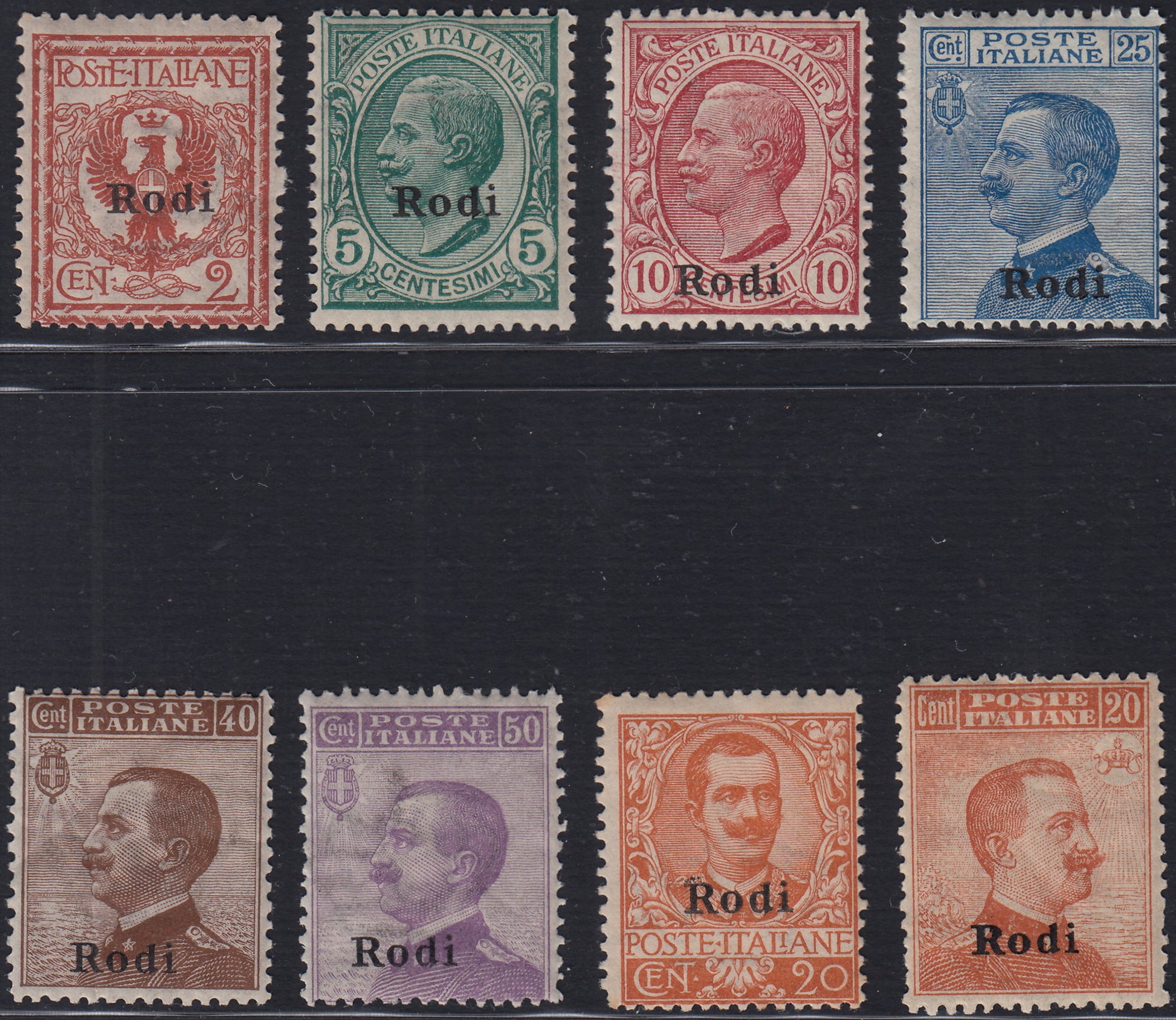 1912 - Francobolli di Regno soprastampati "Rodi", otto valori nuovi gomma integra