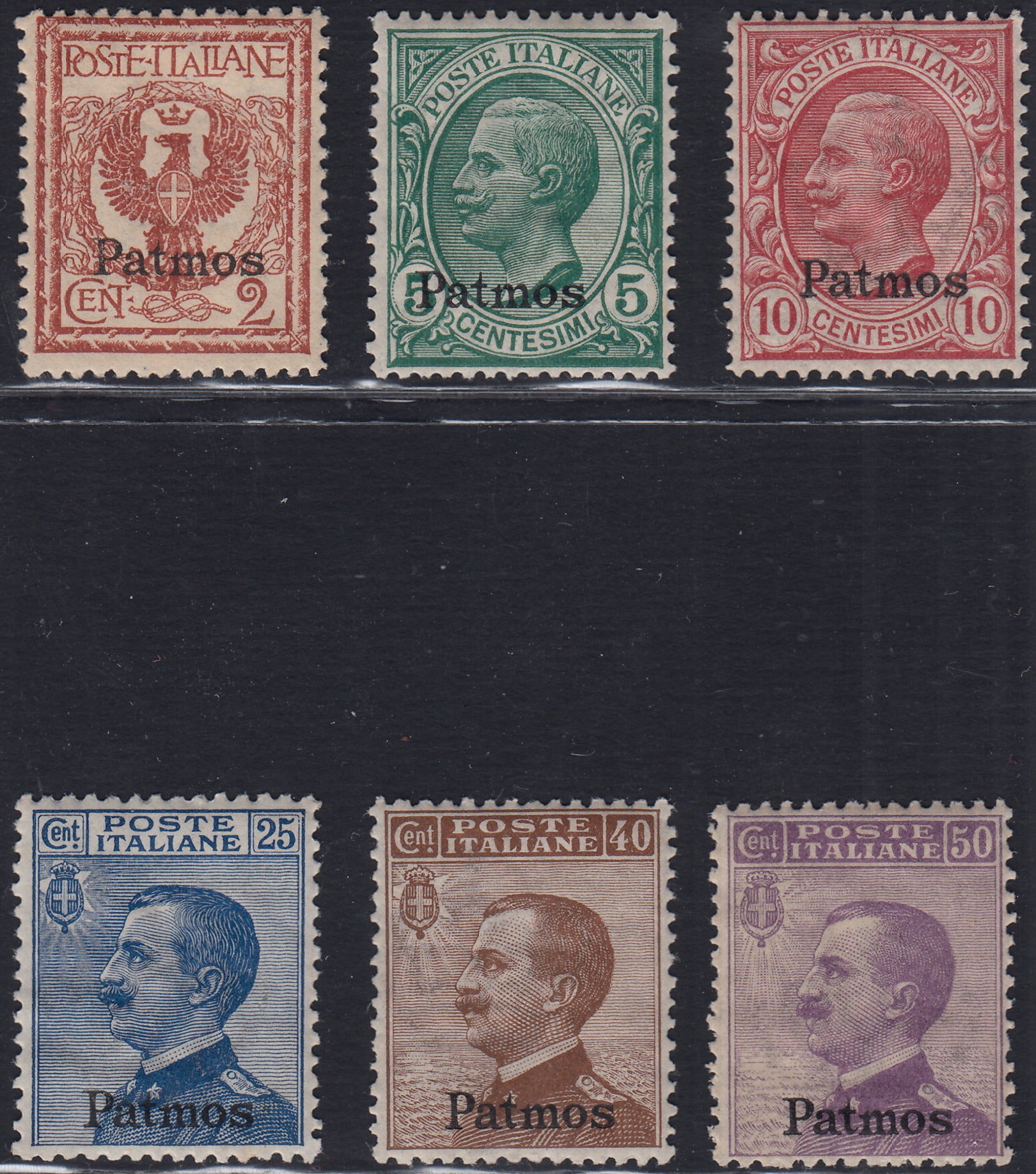 1912 - Francobolli di Regno soprastampati "Patmos", sei valori nuovi gomma integra