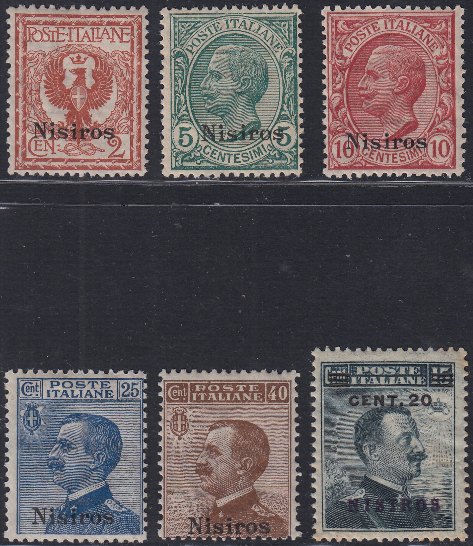 1912 - Francobolli di Regno soprastampati "Nisiro", sei valori nuovi gomma integra