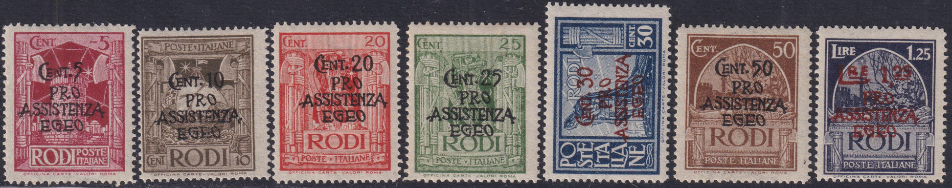 1943 - Occupazione tedesca dell'Egeo, francobolli della serie "Pittorica" del 1922 soprastampati PRO ASSISTENZA EGEO, serietta di sette valori nuova con gomma integra