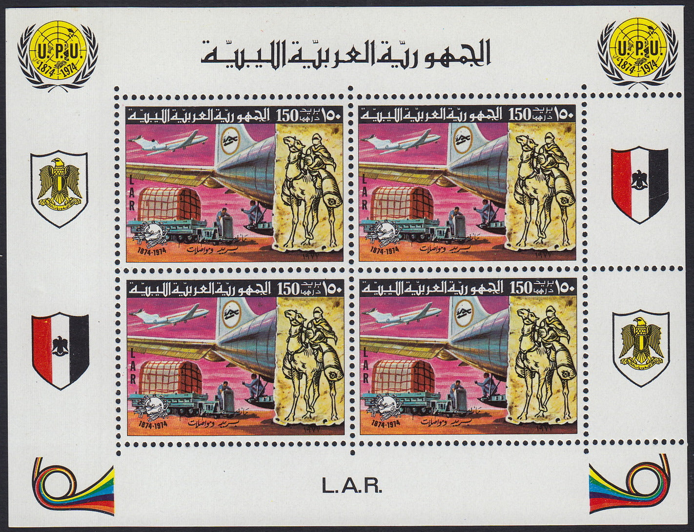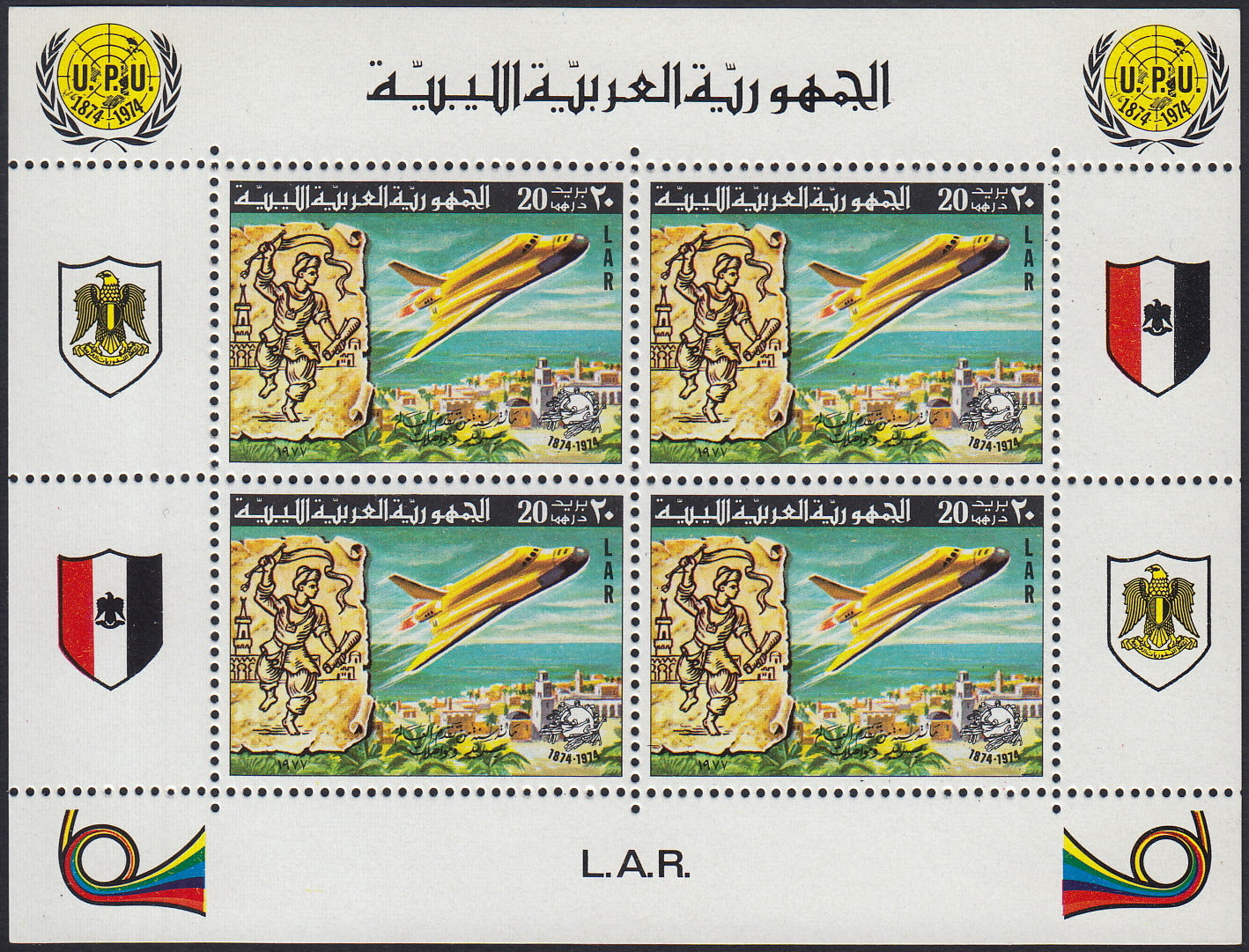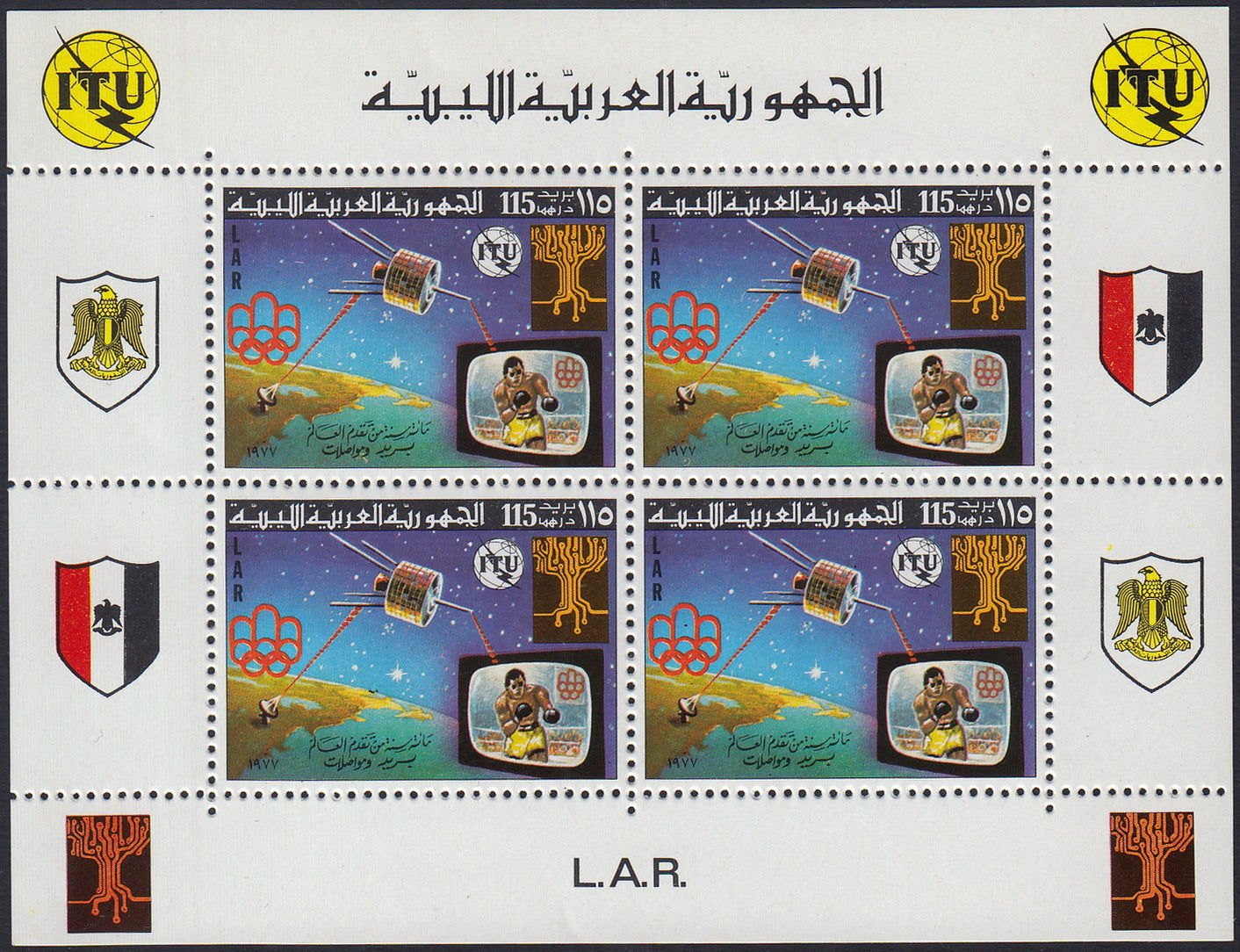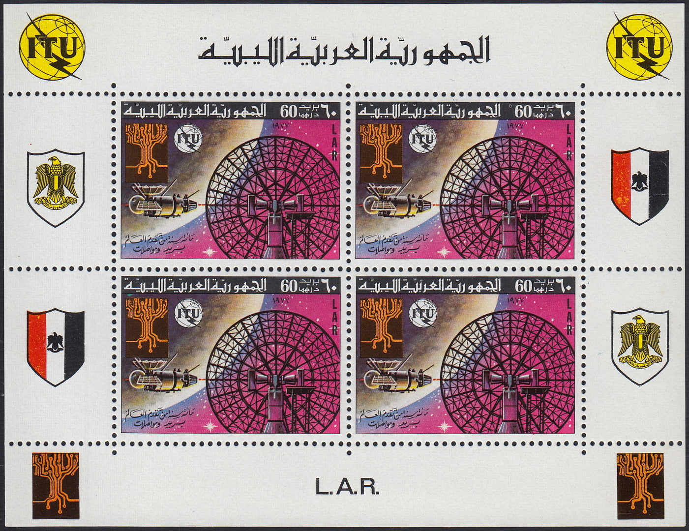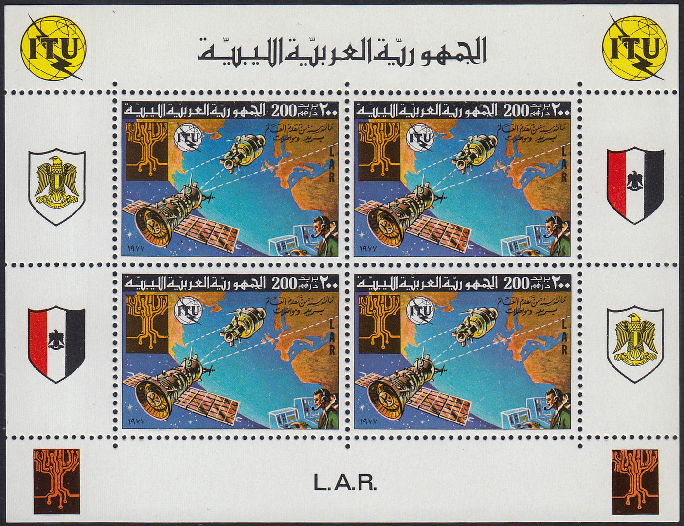 1977 - L.A.R. - Centenario della UIT, serie di sei valori in foglietti da quattro con appendici, nuovi con gomma integra