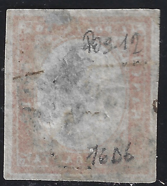 1861 - Effigie di Vittorio Emanuele II, IV emissione c. 40 vermiglio mattone chiaro posizione n. 12 del foglio usato, assottigliato ma colore spettacolare e raro.