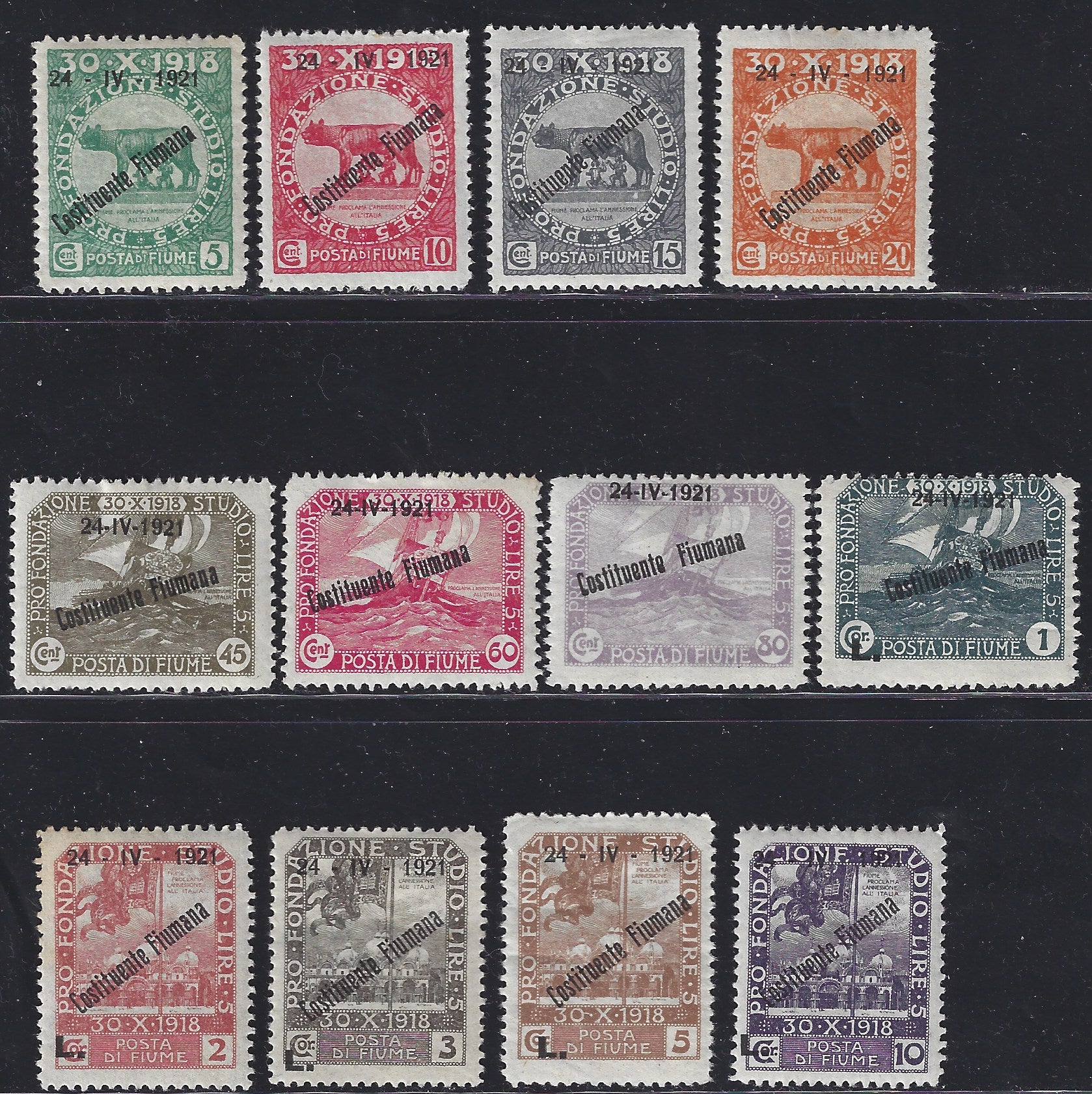1921 - Francobollii "Pro Fondazione Studio" soprastampati "Costituente Fiumana" (I serie) 12 valori nuovi con gomma orignale