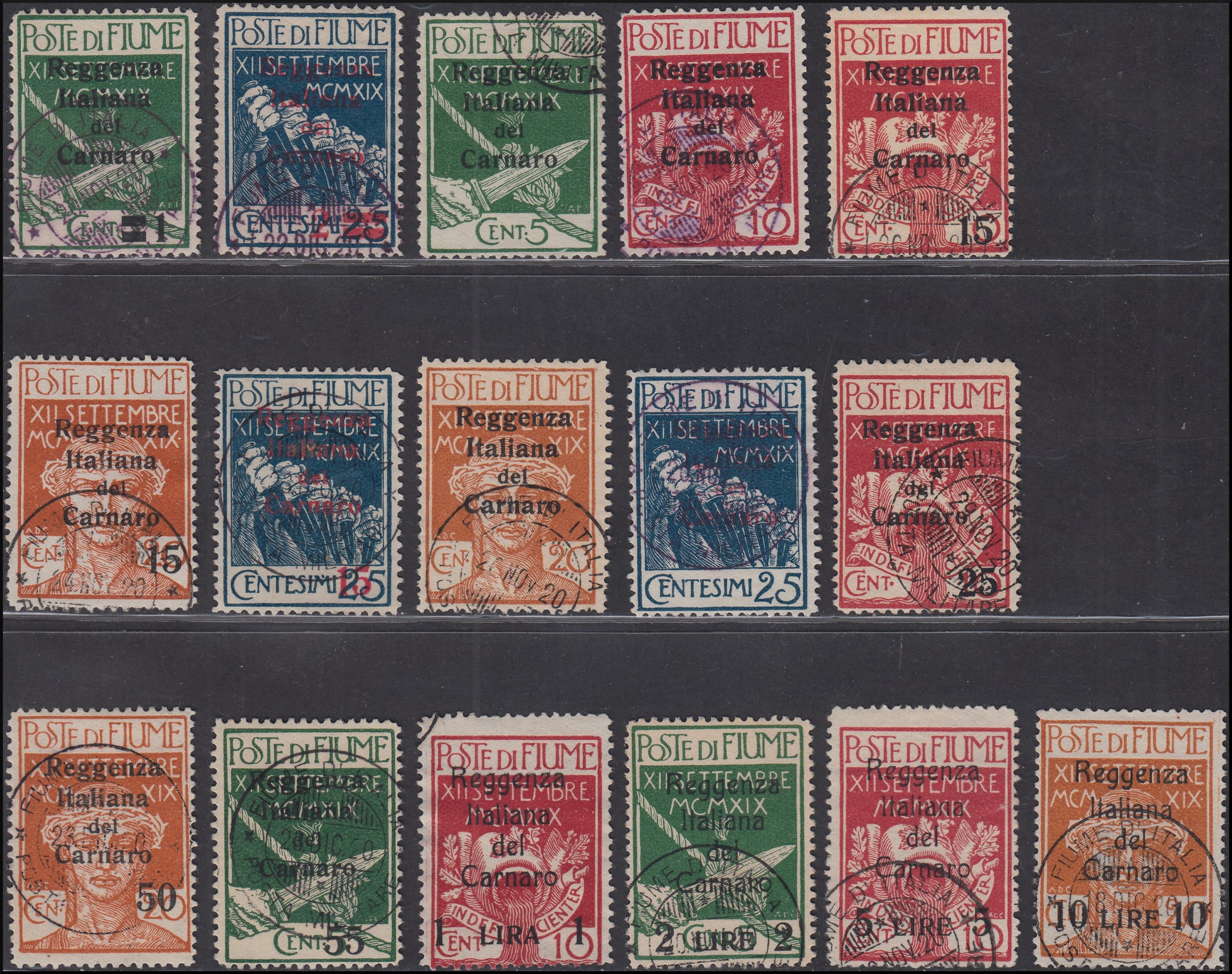 1920 - Legionari di Fiume soprastampati Reggenza Italiana del Carnaro, serie di 16 valori usati