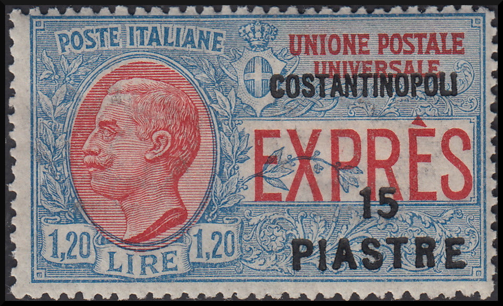 1923 - Espresso per l'estero d'Italia suprastampato localmente con nuovo valore 15Pi su L. 1,20 azzurro e rosso e COSTANTINOPOLI in alto nuovo con gomma originale