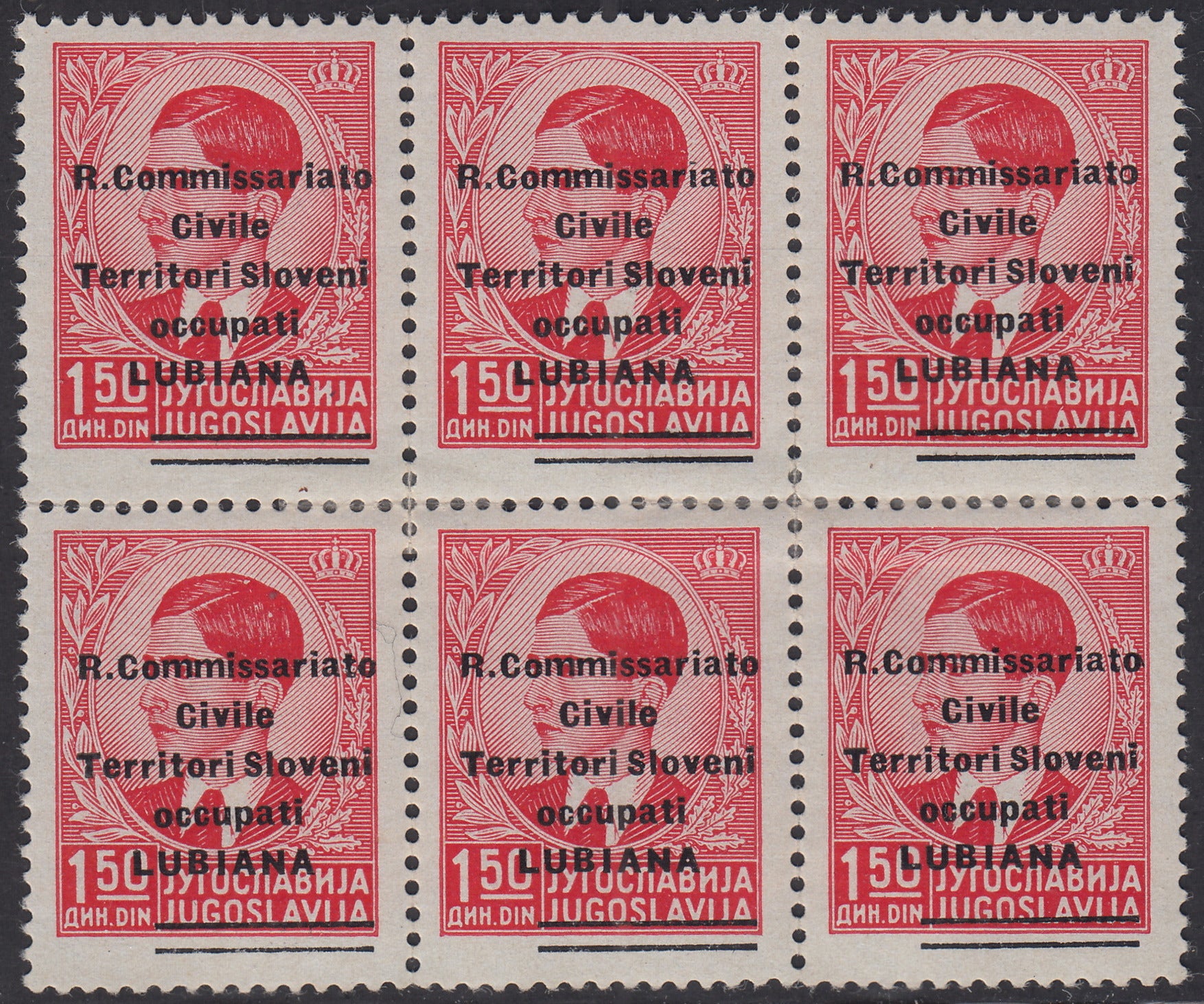Lub33 - 1941 - Occupazione Italiana della Lubiana, 1,50 d. rosso con soprastampa modificata, blocco di sei esemplari nuovo gomma originale (34)