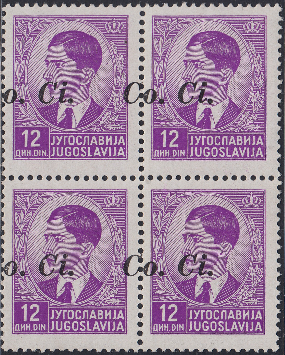 1941 - Occupazione Italiana della Lubiana, 12d violetto blocco di 4 con soprastampa fortemente spostata a sinistra, i valori a destra con solo "o. ci" in soprastampa