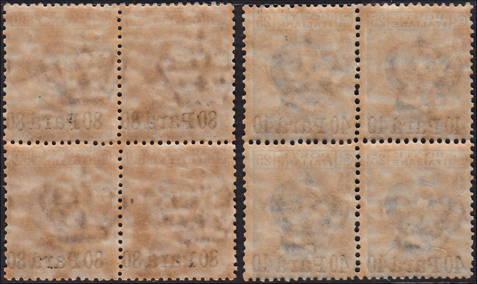 1908 - Uffici Postali all'Estero, emissioni per tutto gli uffici d'Europa e d'Asia, emissione Michetti 25c. azzurro e 50c. violetto con soprastampa in valuta locale, quartine nuove gomma integra