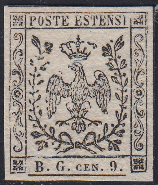 MOD101 - 1854 - Aquila estense, francobollo per giornali b.g. cen.9 lettere piccole prova su carta bianca porosa nuova non gommata (P34)