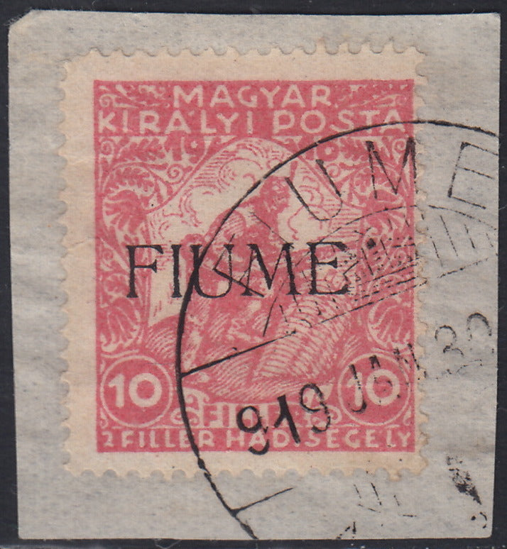 ND118 - 1918 - Francobollo d'Ungheria "Beneficenza", 10 filler (+2) rosa, soprastampa a macchina FIUME, usato su frammento (1Aaa)